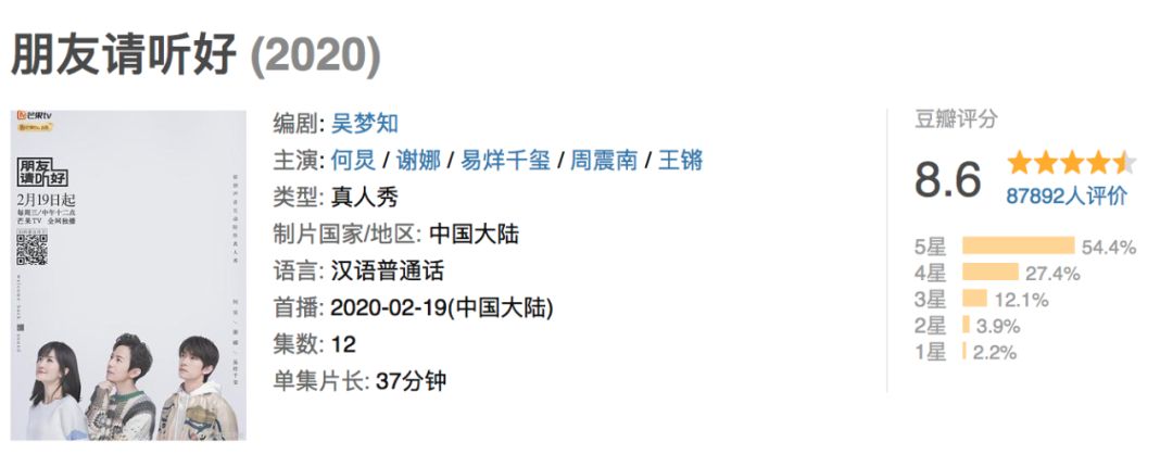 今年的慢综艺《朋友请听好》里,除了有何炅老师,还有谢娜和易烊千玺。上线将将1个月,已经是8.6的高分(据说豆瓣的开分时是9.4分)。