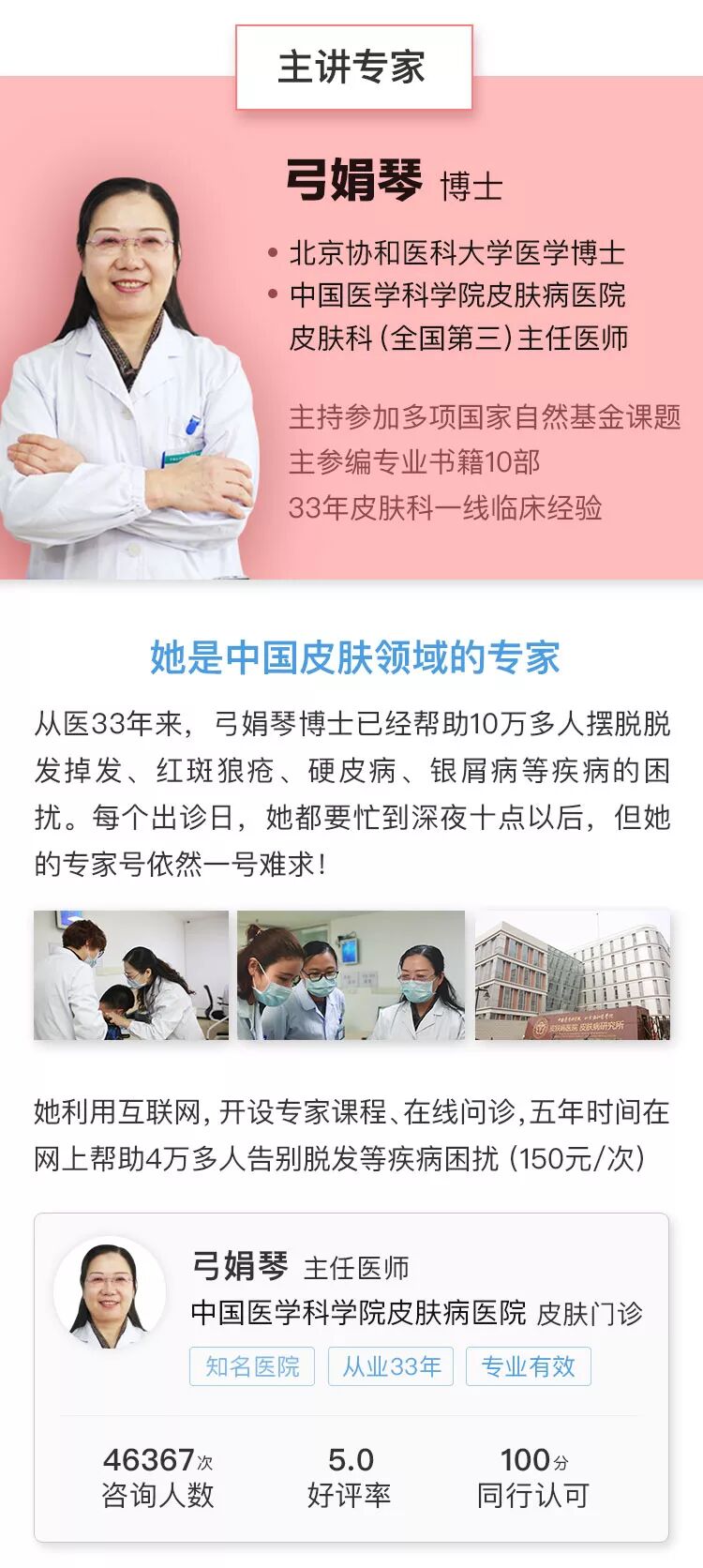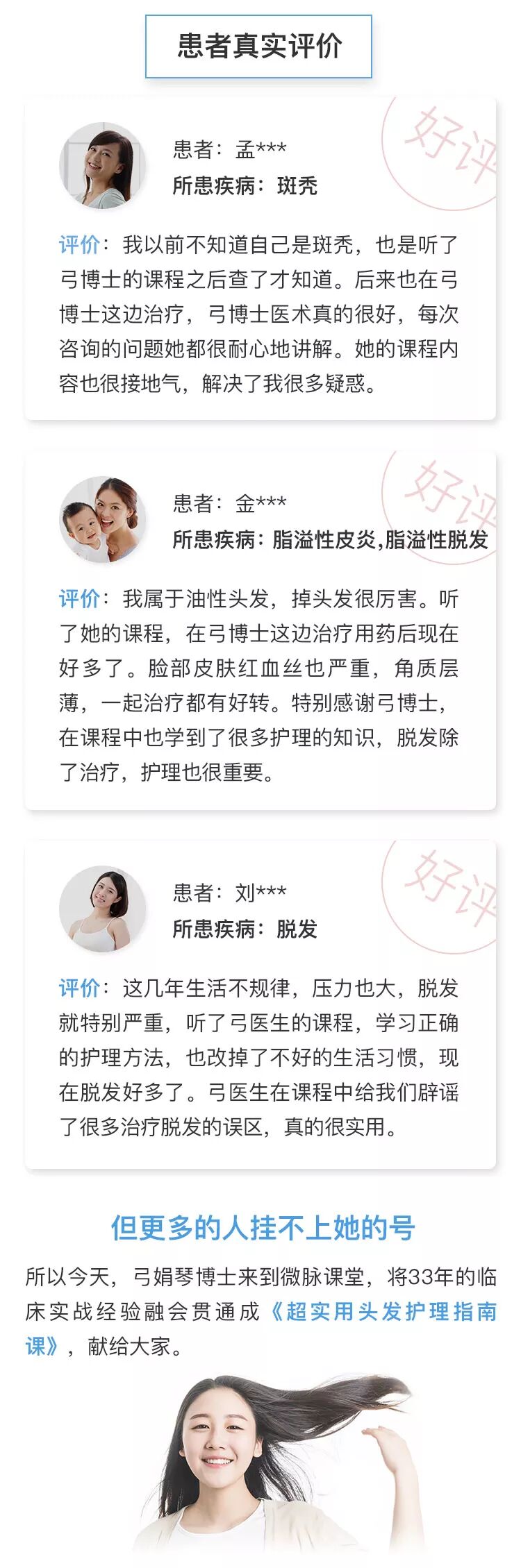 本周微脉课堂特别邀请到北京协和医科大学博士弓娟琴主任医生为我们有脱发问题的小伙伴带来生动且实用的《11堂超实用护发课,彻底为你解决脱发掉发/发质脆弱/频繁出油/产后脱发等困扰》课程。