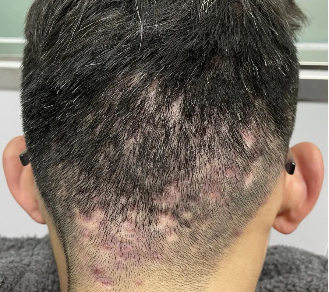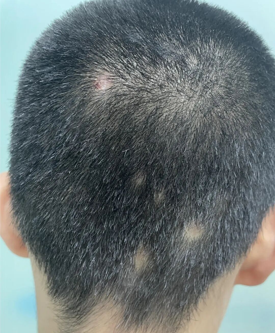 临床表现:秃发性毛囊炎是一种临床上炎症强烈的瘢痕性秃发,主要发生于青壮年男性,慢性病程,表现为频繁发生的毛囊周围丘疹和脓疱,愈合后留有圆形或椭圆形萎缩性瘢痕,枕后部最严重。