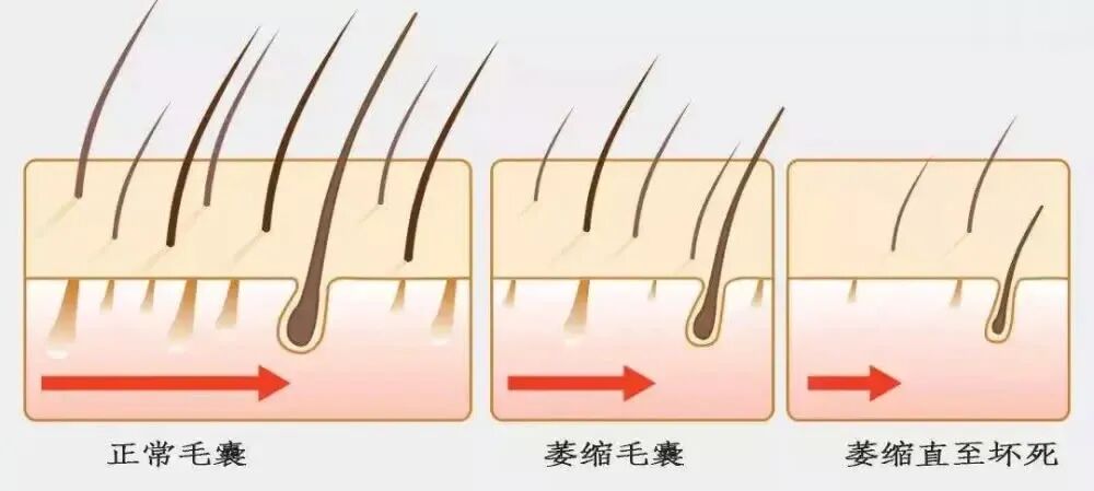 当头皮中的DHT达到一定量的时候,毛囊会萎缩,头发的生长周期逐渐变短,头发就越来越少了。