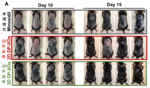 在动物试验方面,2020年8月的《科学》杂志的子刊Science Advances报道了美国北卡罗来纳州立大学的程柯教授团队的一项研究。这项研究主要有两个成果:一是,在小鼠试验中发现了3D培养的毛乳头细胞(DPs)的外泌体能够逆转毛囊微型化,从而使毛发再生;二是,从外泌体中筛选出了效果最好的一种miRNA分子——miR-218-5p,或可将其用于开发治疗脱发的药物。