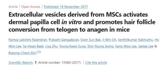 韩国大邱庆北大学医学院的科学家Ramya Lakshmi Rajendran,Prakash Gangadaran等在Scientific Reports发表文章指出,来自间充质干细胞(MSCs)的细胞外囊泡在激活真皮乳头细胞并促进毛囊从休止期转变为生长期(Extracellular vesicles derived from MSCs activates dermal papilla cell in vitro and promotes hair follicle conversion from telogen to anagen in mice)。