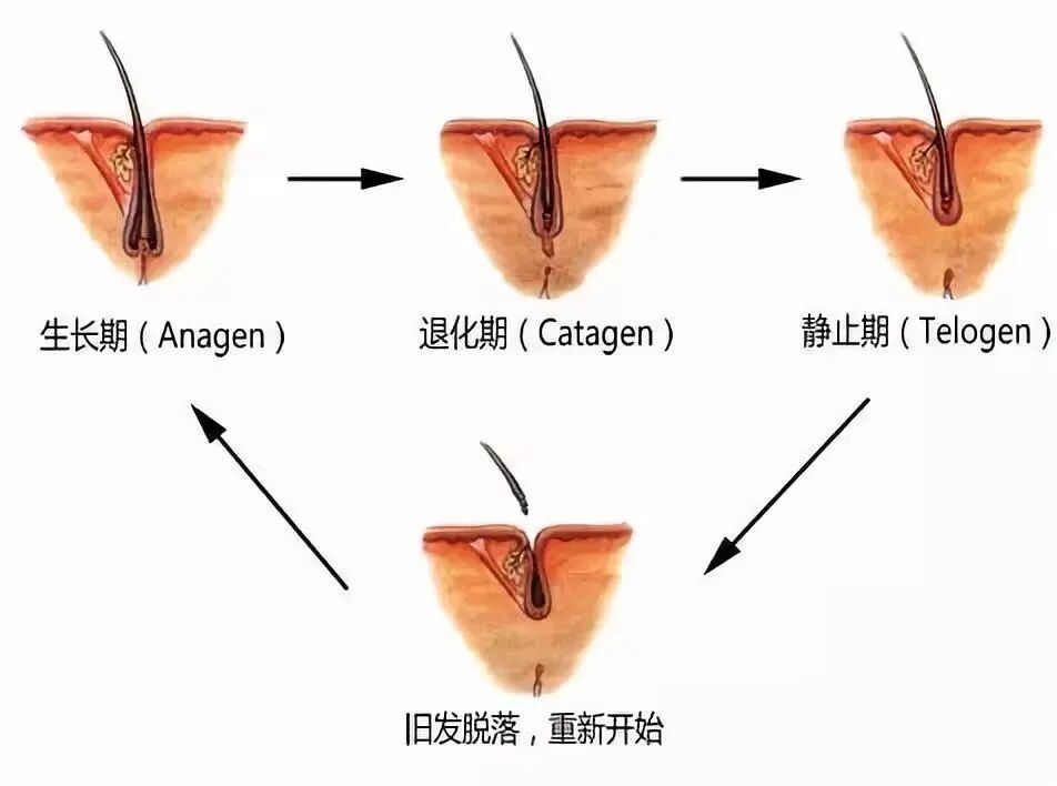 头发不断地生长和脱发,如同花开花落再开花,呈现周期性,可分为三个阶段:生长期、退行期、休止期。