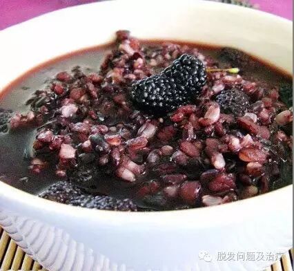 功效:红枣含有丰富的维生素C,有益气养血作用;核桃仁含有蛋白质,脂肪,B族维生素,以及锌,具有补气益血,养颜乌发,滋肾固精的功效;桑椹子滋阴养血,润肠通便,乌发,黑豆补肾固精,乌发美发,此粥适宜于调理肾亏血虚所致的脱发现象。
