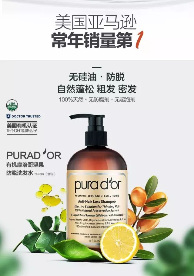 美国生产的 Pura dor 金标,全名好像叫纯有机摩洛哥坚果防脱固发洗发水。这个牌子还有一款蓝标的洗发水,但金标这个更适合脱发人群。