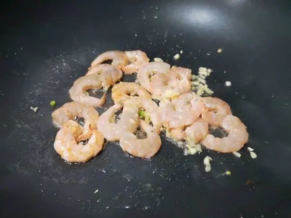 6.闻到蒜香味出来后,倒入虾仁翻炒至变色。