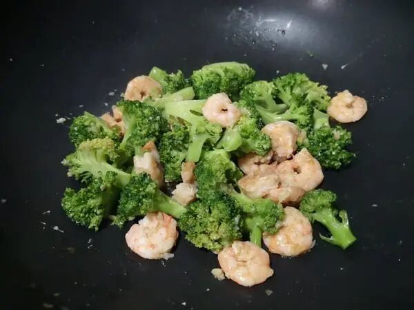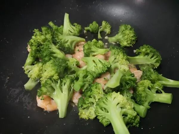 7.虾仁变色后马上倒入焯烫过的西兰花,继续翻炒。