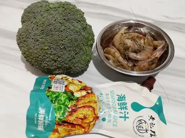 西兰花 1个、虾 300克、海鲜汁 10克、蒜 2克、料酒 10克、花生油 5克