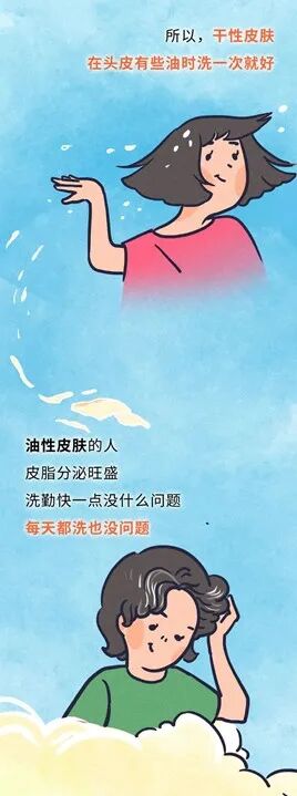 第五张图:干性皮肤可以等油了再洗头发,油性皮肤每天洗头发也没问题。