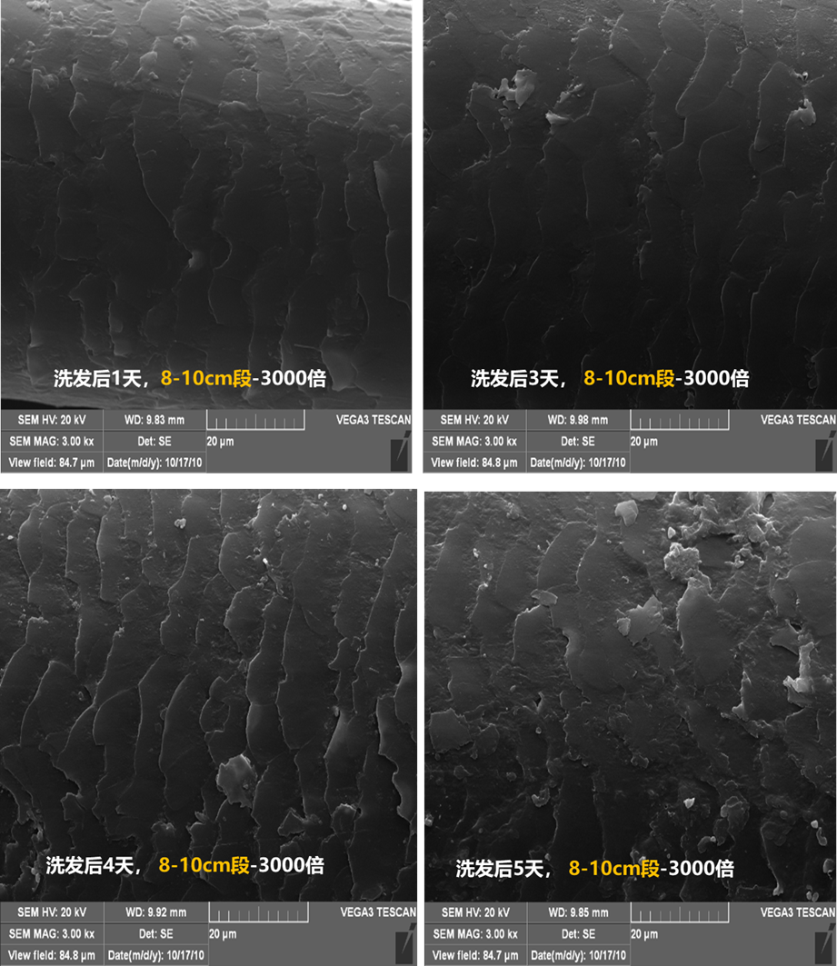 第二套图:我是长发,做了个有趣的实验,靠头顶部容易脏。洗发后3天,距离发根2cm、4-6cm的头发部位已经有尘埃了;距离发根8-10cm处的头发尘埃就很少了,发尾部分3天后基本还是洁净的。