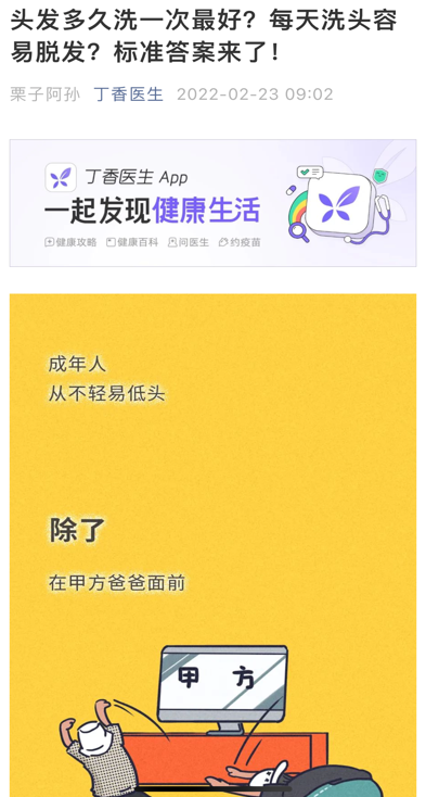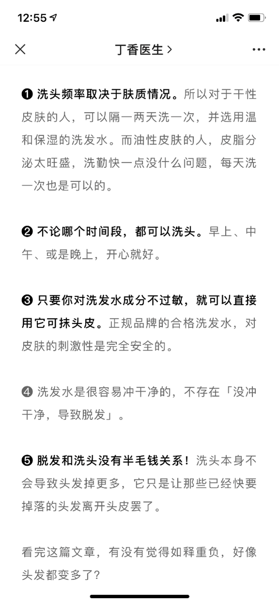 我其实不太关注丁香医生的科普文章,对我来说没太多用处,今天不知道为什么一篇丁香医生公众号的文章蹦到了我的手机页面,十几秒浏览了下,实在觉得应该花点时间吐槽下,它的其他科普文章我不知道,起码这篇文章有太多值得商讨的地方。这篇文章的题目是:头发多久洗一次最好,每天洗头容易脱发吗?标准答案来了!