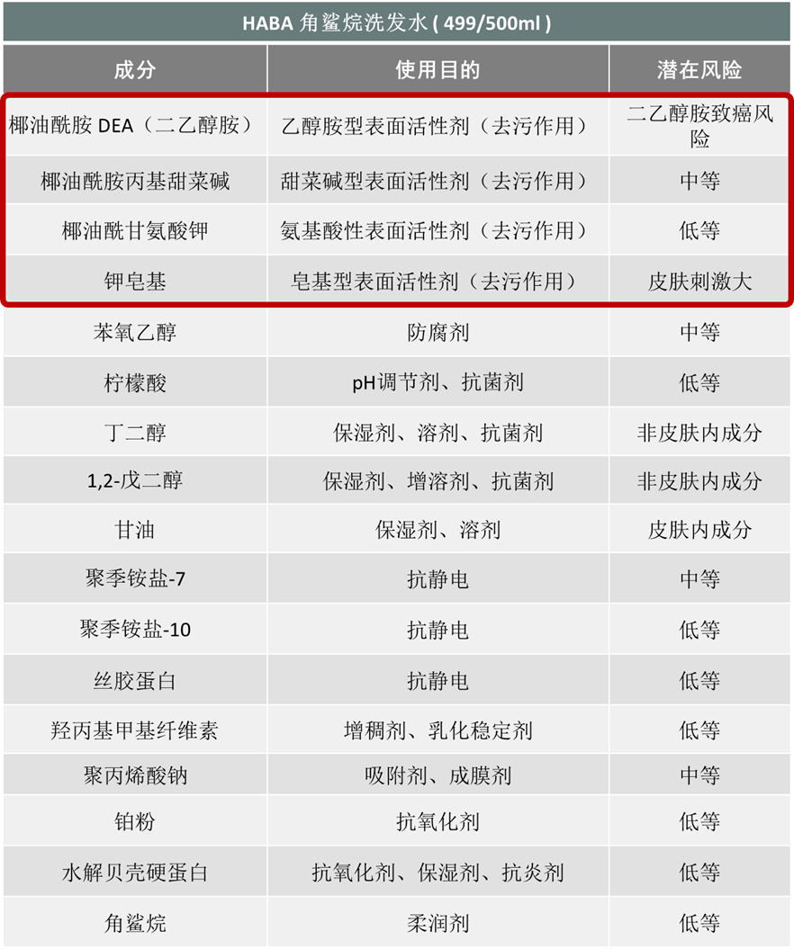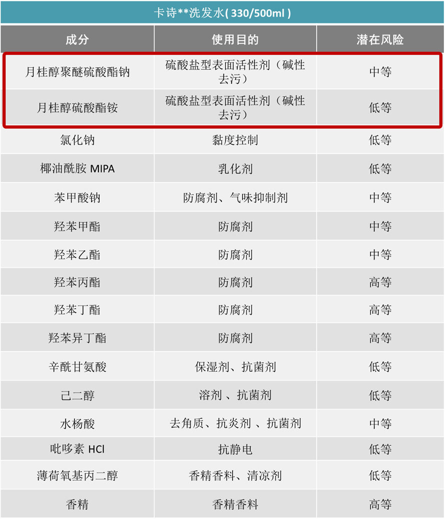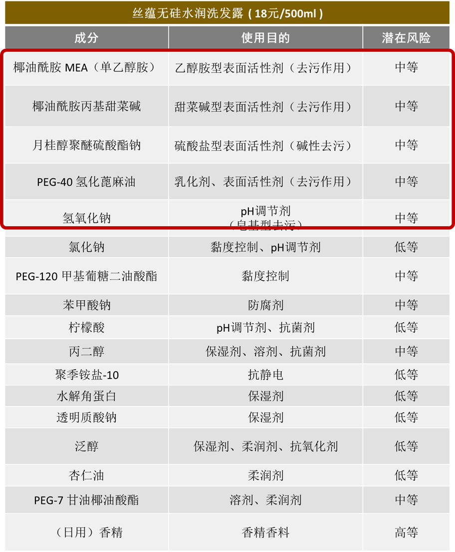 辩识方法:脂肪酸和碱剂、肉豆蔻酸、月桂酸、棕榈酸、硬脂酸、氢氧化钠、氢氧化钾、三乙醇胺,也就是说同时出现脂肪酸和碱,或者直接出现脂肪酸钾、脂肪酸钠,就可以判断是含有皂基的产品。前面499元及18元每瓶的洗发水,均属于皂基型。
