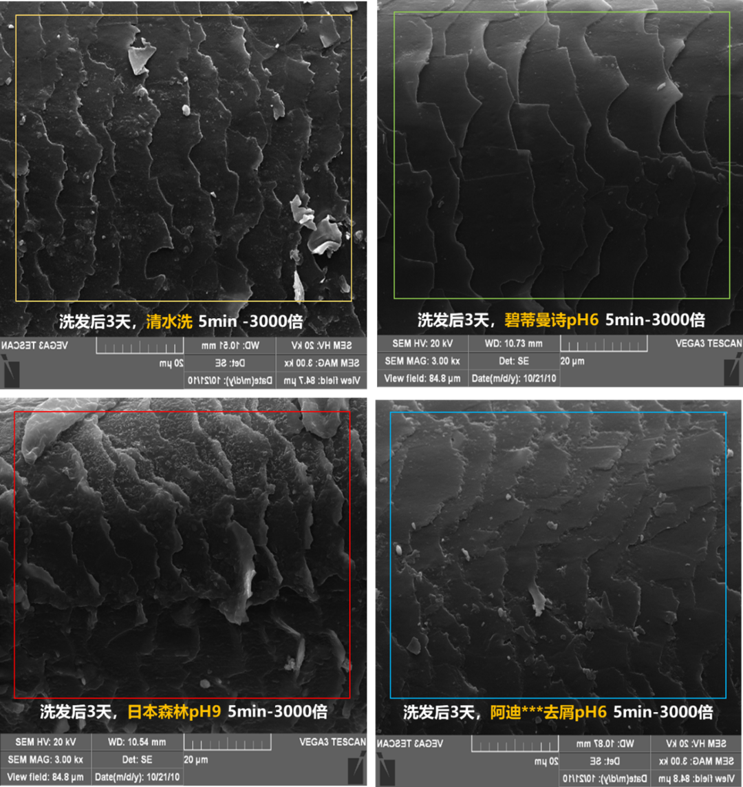 第3张图是日本一个品牌的洗涤剂,用的是皂基型pH=9,为碱性,可见洗后的头发上有很多吸附物,且毛鳞片卷翘、毛糙;