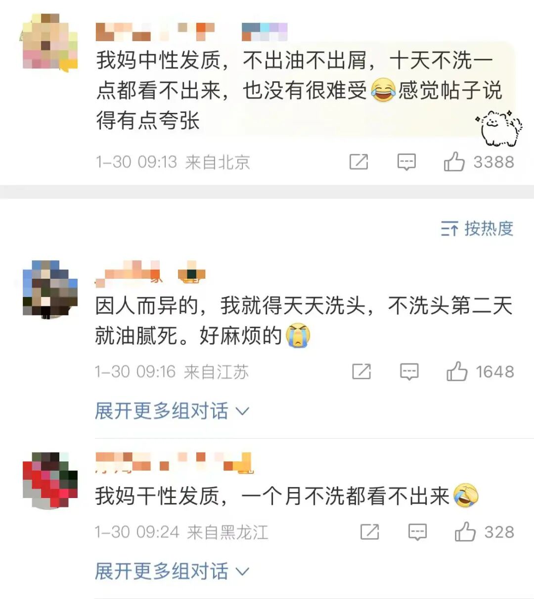 在微博话题中,有约君看到不同发质的人对洗头的频率说法不一。