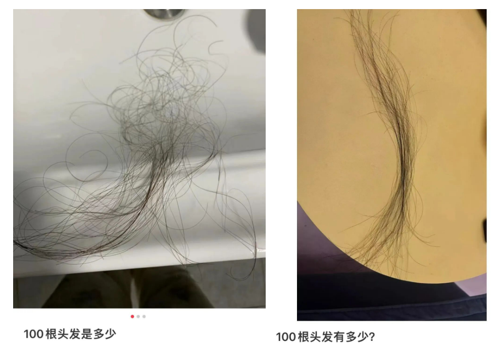 2) 每天在地面、枕头上、梳子上收集到的自然脱落的头发数量超过了100根;或者用手指指腹抓住一撮头发(约50-60根),轻拉头发的不同部位,重复5-6次。若每次牵拉有超过6根或更多的头发脱落;