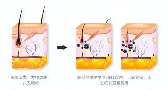 雄激素性脱发:与遗传以及雄激素水平有关。