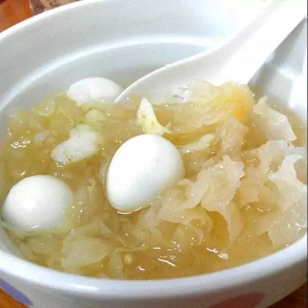 银耳鹤鹑蛋:取银耳15g,鹤鹑蛋10只,冰糖少许。将银耳摘洗干净,上笼蒸约60分钟,将鹤鹑蛋用冷水煮熟,剥去皮。用小铝锅加清水和冰糖煮沸,糖溶,放入银耳、鹤鹑蛋稍煮片刻,撇去浮沫,盛入碗内即成。
