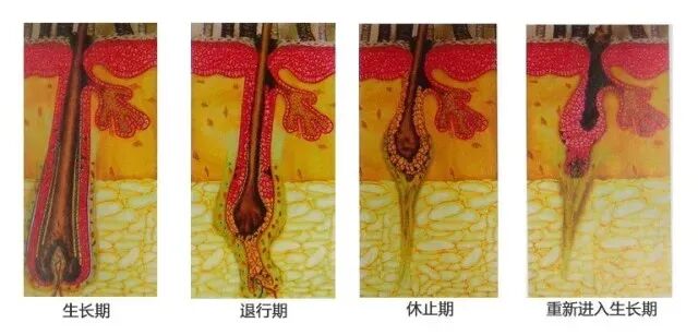 毛发的生长情况是根据毛囊的生长周期来决定的,包括:生长期、退行性、休止期,每个毛囊都有独立的循环生长周期,这样保证头发不会大量脱落。