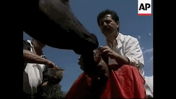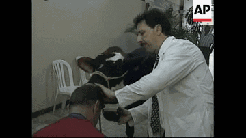 为了让奶牛舔人的头,民医会在顾客的秃头上涂上糖蜜、燕麦和饲料。