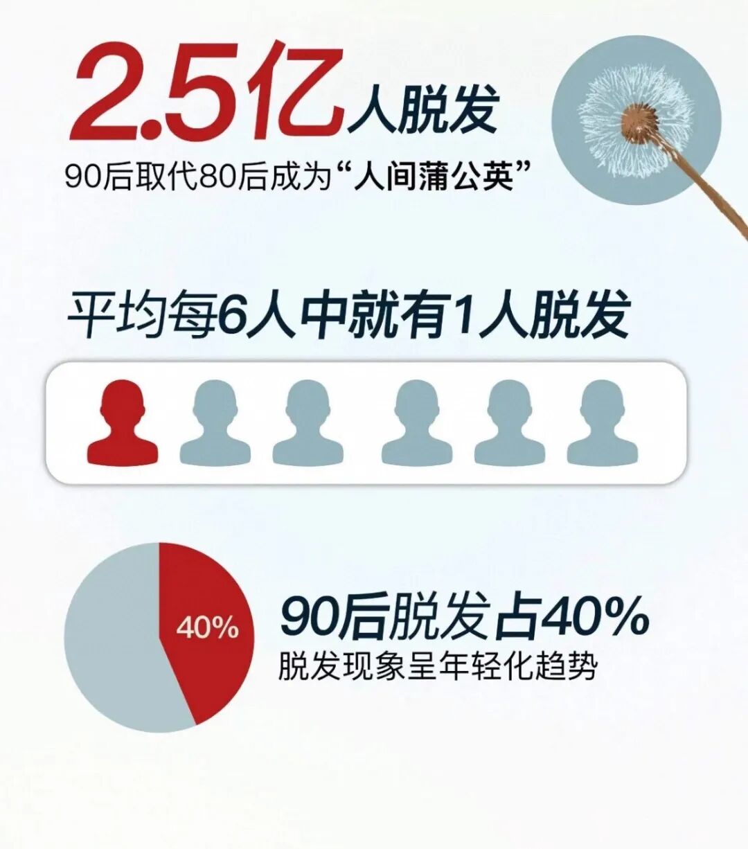 现如今 脱发早已不是中老年人的专属了! 根据调查显示🔍 由于工作压力和生活方式的改变 不少90后甚至00后 都已经加入了脱发😱的行列❗️ 中国约2.5亿人存在脱发问题 平均每6人中就有1人脱发 其中90后占比上升 占39.3% 超越80后 脱发现象呈现年轻化趋势