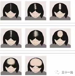 所以女人稍微幸运一点,雄激素总量没男人多,脱发的严重程度也不会像男人一样变成锃亮的地中海,总还是有些许几根头发的。而女性脱发到7级的比例也相当小。