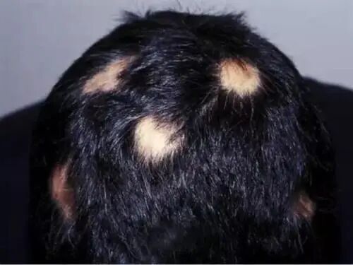 斑秃多见于工作压力较大,与情绪、内分泌息息相关。斑秃表现为头顶某部位出现硬币大小的脱发区,无炎症及瘢痕症状。