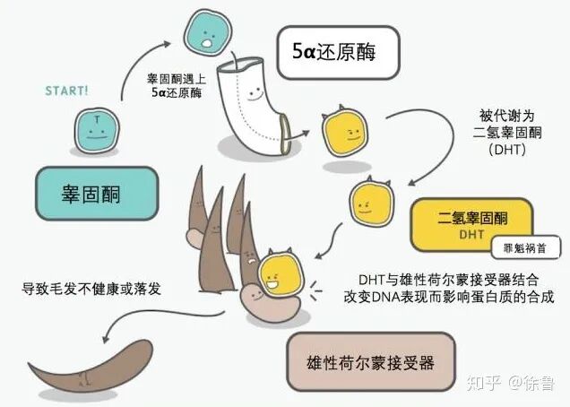 对于AGA而言,易感毛囊中真皮成分细胞内含有特定的Ⅱ型5α还原酶,可以将血液中循环至该区域的雄激素睾酮转化为二氢睾酮,通过与细胞内的雄激素受体结合引起一系列反应,进而使毛囊出现进展性的微型化和脱发直至秃发。