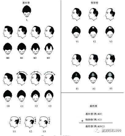 4种基本型L、M、C和U,代表前发际线的形状,每种类型再根据脱发的严重程度进行分级;而2种特殊型F 和V,则代表特定区域(额部F 和顶部V)头发的密度,每种类型再根据脱发的严重程度进行分级。