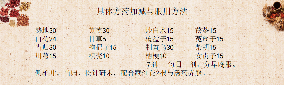 本方以八珍汤为基础,旨在补益气血为主,方中女贞子、菟丝子、覆盆子滋补肝肾、益精生发,制首乌、白芍、熟地黄补血养血生发,枸杞子益肾健脑生发,藏红花、当归、川芎补血活血、行气生发,黄芪补气血、生津,茯苓、白术健脾益气宁心,甘草调和诸药。再加之患者情绪低落,以柴胡枳壳宽胸理气,桔梗载药上行,枳壳、桔梗一升一降,运转中焦枢纽,条畅气机。全方共奏补肾益气养血、生发之功效。-生-
