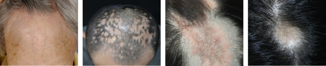 (由左至右分别为:额部纤维性秃发、毛发扁平苔藓、盘状红斑狼疮、头皮硬斑病)