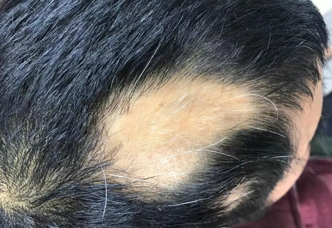 这位患者是一个长期船员,长时间走国外船的。这是一个典型的斑秃,民间又叫鬼剃头,是自身免疫性疾病,免疫系统的紊乱和局部免疫炎症反应过强是病因,部分人可在睡眠不佳、精神压力过大等情况下诱发,表现头部突然出现圆形或椭圆形的脱发斑,最初为小片脱发区,一片或几片,无自觉症状,少数病人在短期内头发可全部脱落故称全秃,如体毛亦脱落,则称普秃。