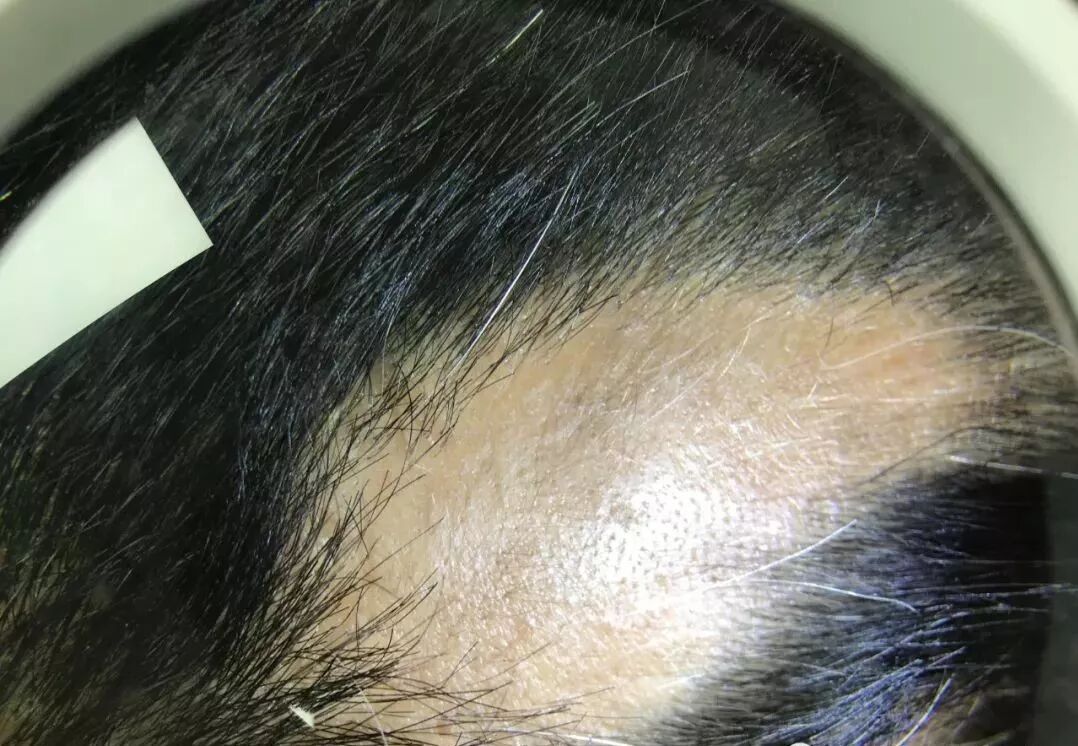 患处头皮萎缩,光滑而带有光泽,看不见毛囊开口,斑片边缘处无上粗下细的脱发。
