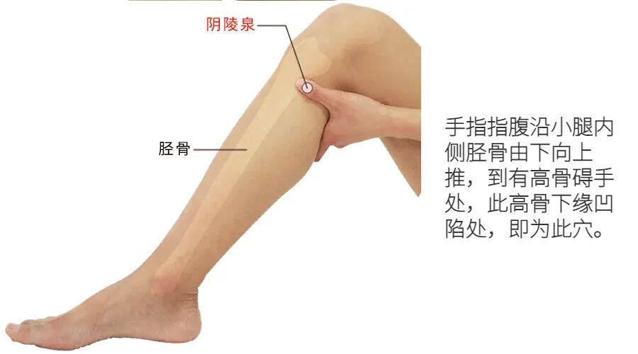 「阴陵泉」:食指沿小腿内侧骨内缘向上推,抵膝关节下,胫骨向内上弯曲凹陷处即是。