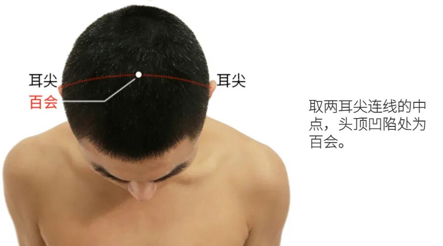 「百会穴」:头顶正中线与两耳尖连线的交点处。