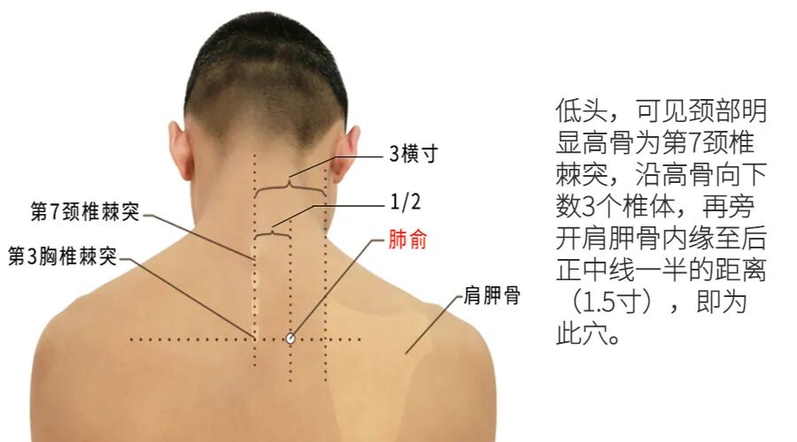 「肺俞穴」:在背部,当第3胸椎棘突下,旁开1.5寸。