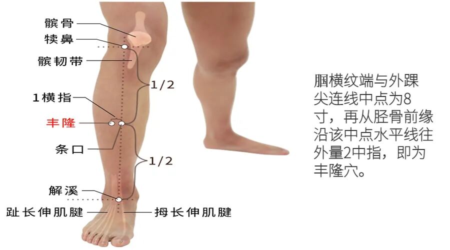 「丰隆穴」:在小腿前外侧,当外踝尖上8寸,距胫骨前缘2横指(中指)。