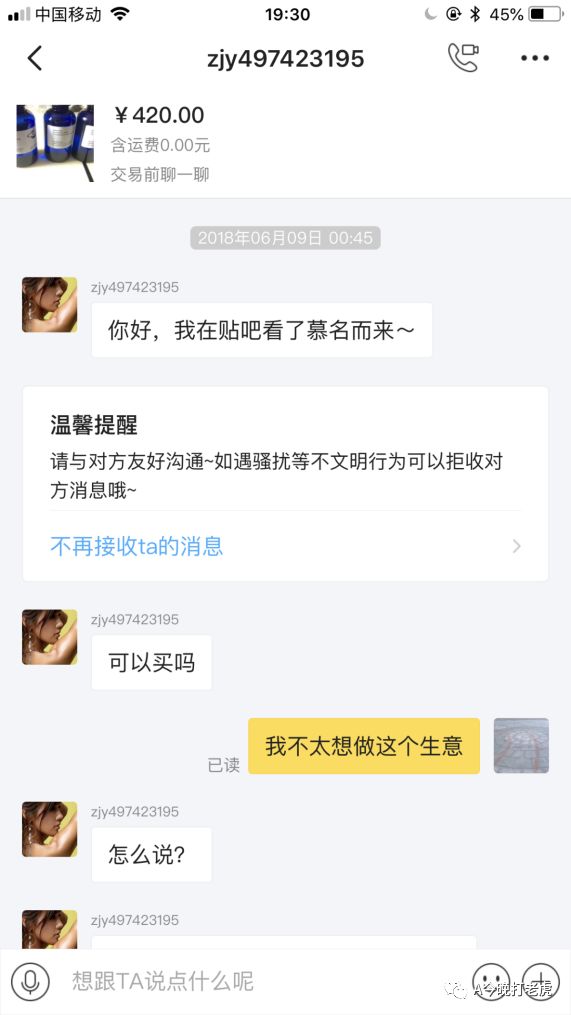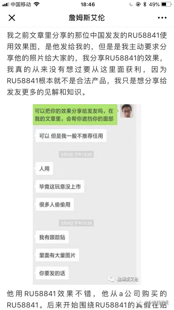 自从詹姆斯艾伦发了文章再一次谈谈ru58841便引起利益相关者的恶意攻击,我们简称这个人为A吧,A过去也算一个脱发问题公知,对脱发知识也有一定造诣和科普过。只是经过历史验证A只不过是一个脱发产业商人而已,喜欢制造舆论,为达目的张口就来。A直接攻击詹收取anageninc公司广告费给RU做广告,可是这照片是我的,也是经过我同意才发表的文章,怎么一下子成为营销文了?而且詹在之前的文章也没说RU的来源就是a公司。搞得詹很生气地发表了文章一起来调查RU58841的真相!把我跟他之前的聊天记录证据发了出来。