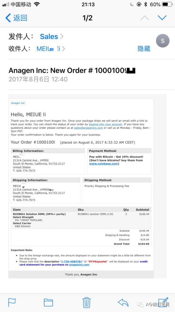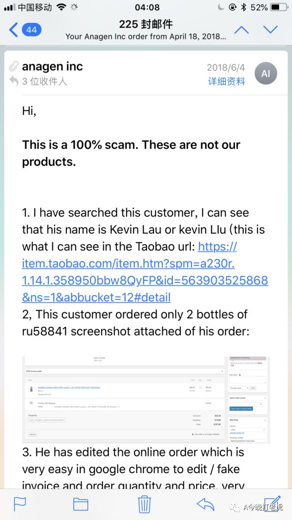 当时,我观察到了之前闲鱼代购我有点难开的淘宝店销售的RU是银色铝瓶包装的,而我自己海淘的版本是蓝色塑料瓶的。所以我把疑虑用邮件反馈给了Anageninc公司,想不到他们直接回复我这家店卖的是假货,查询了该卖家的订单账户后发现大多是伪造,恳请我帮忙发声,让发友们知道真相。