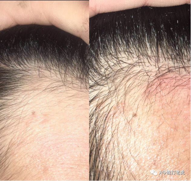 (分享其中一个经验给大家,从Youtube我了解到这个人没有用药物单单使用硬梳子按摩头部刺激生长,除额角外获得很不错的效果。后来我也看到有人写关于按摩头皮的正向文章,没事就多按摩吧这类似微针)