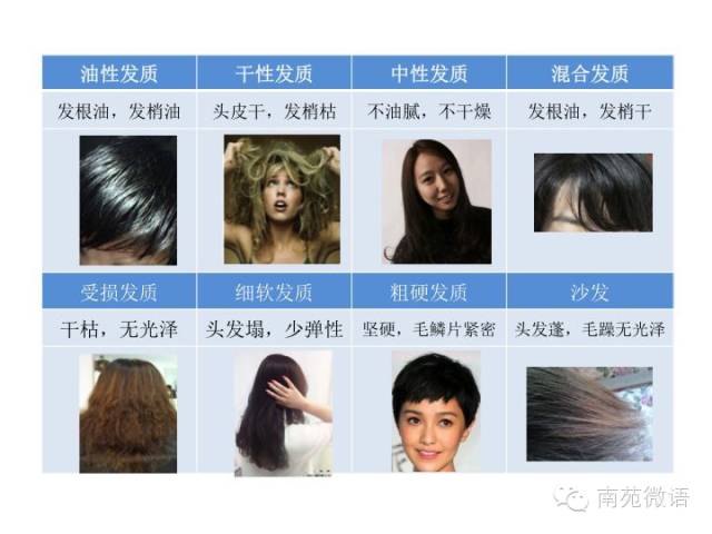 头发的发质到底分为哪几种类型,粗略地看来,可以分为八种。油性,干性和中性,这是根据整个头皮到发根这个位置是否油腻来判断的;然后还有一个叫混合发质,我会稍微重点的讲一下,因为有这个发质的人群是比较多,并且这种发质也不是特别好对付;下面受损发质,很容易理解;细软和粗硬是根据这个发质的软硬程度的判断;还有一个是叫沙发的发质,很多女孩子有这种头发,头发比较粗,比较浓密,但是干涩毛躁,非常没有光泽,所以就有一个名词,叫沙发。