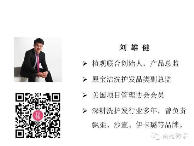 我先简单做个自我介绍。我叫刘雄健,2002年进入南大信息管理系,2009年硕士毕业之后进入宝洁,做过洗发水,也负责过护肤品。现在是一名创业狗,依然做洗发水,品牌叫植观。因为接触洗发水的时间稍微长一点,跟大家来分享我对这个生活必需品一些简单的认识,也希望能够对大家有一点点帮助。