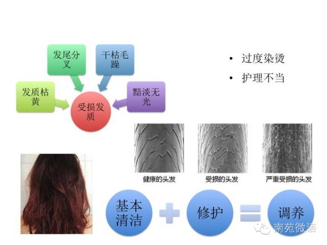 很简单,就是过度的染烫发。我刚才也讲过,烫染时要打开这个毛鳞片,药水进入到毛皮质这一层,然后对里面的一些结构进行一些重组,对头发有些破坏。另外,如果后期的护理也不是非常恰当,发质受损会更加厉害。