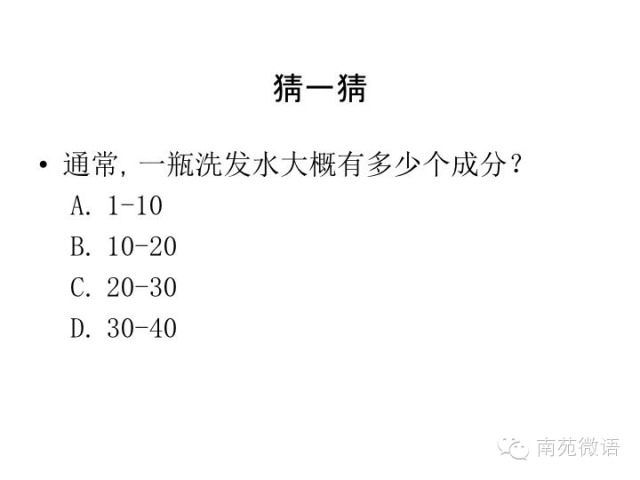 答案:应该是第三个,大概在20到30个。也有些国外的洗发水可能有超过30种甚至40种成分,但普遍来讲,大概在20到30之间。整体来说,洗发水的成分可能比大家想象的要稍微多一些。