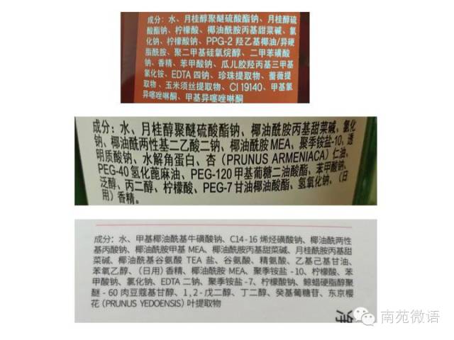这里有几个例子,大概可以看一下,如果平时大家在使用或是购买洗发水的时候有留意的话,应该看到它的包装上面应该是有一个成本表的,按照国家的法律要求,洗发水的整个成分是需要清楚的标注在这个洗发水的外包装上面。