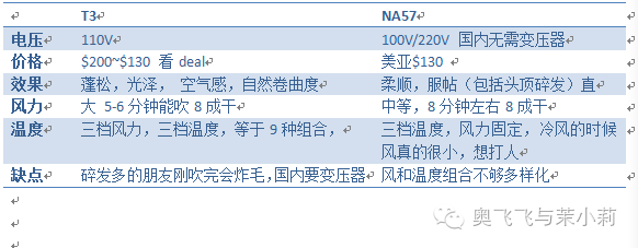 吹风机:我妹的T3拿回国电压不对烧坏了,我就给她新买了一个,寄到我家的时候我就先干为敬开箱用了用(哈哈比❤,爱你哦),马上决定我要换吹风机。但是我和她诉求不同,最后我买了松下的NA57. 刚好最近用了这两款,我做个表格对比下,网上也有很多mm纠结要买哪个。