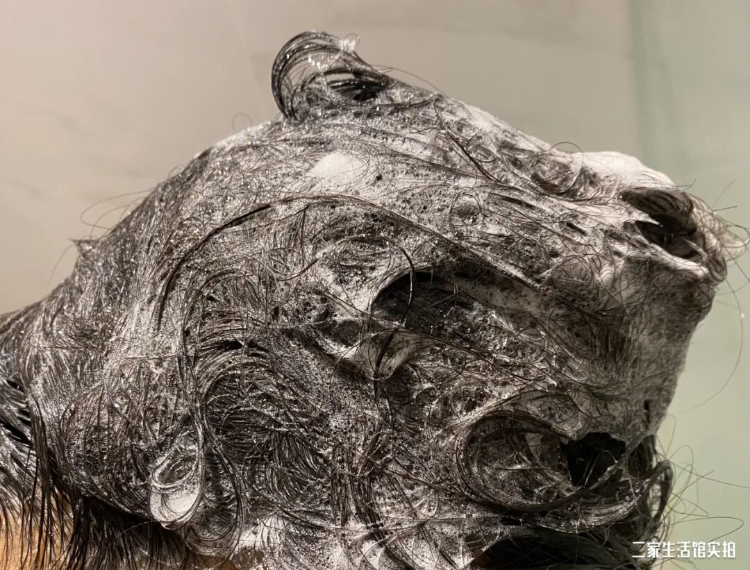 在手里挤两下,搓出的泡再抹到头发上。泡沫细腻绵密,每一根发丝都能被裹住。