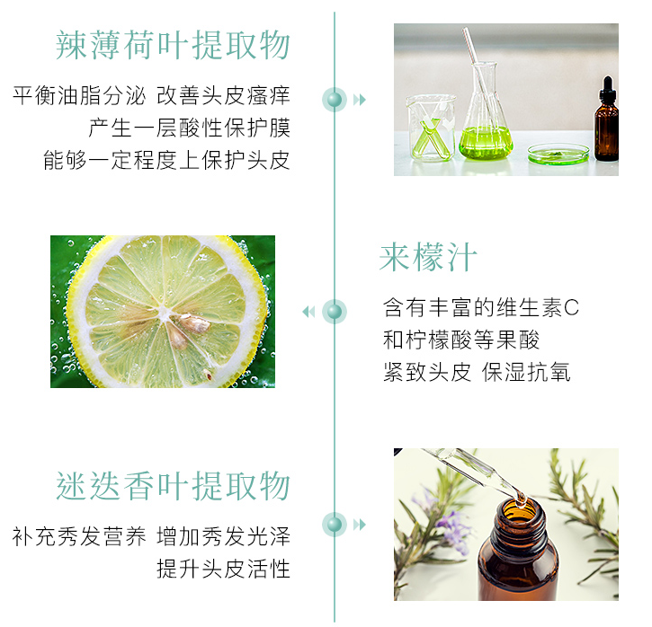 除了前面说过的三大核心成分,它还另外添加了辣薄荷叶提取物、来檬汁、迷迭香叶提取物。
