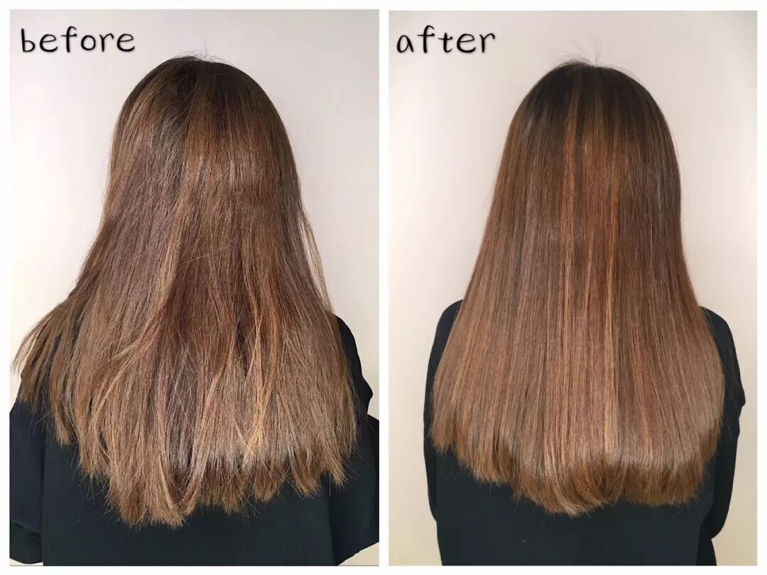 使用前后的对比可以非常清晰的看到抚平毛躁和顺滑的效果,1分钟发质跟光泽度都提升了一个level!