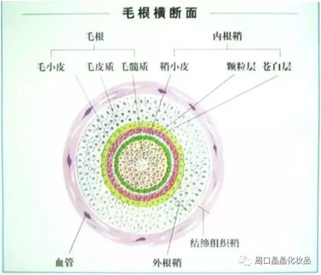 毛表皮是扁平细胞交错重叠成鱼鳞片状,从毛根排列到毛梢,包裹着内部的皮质。