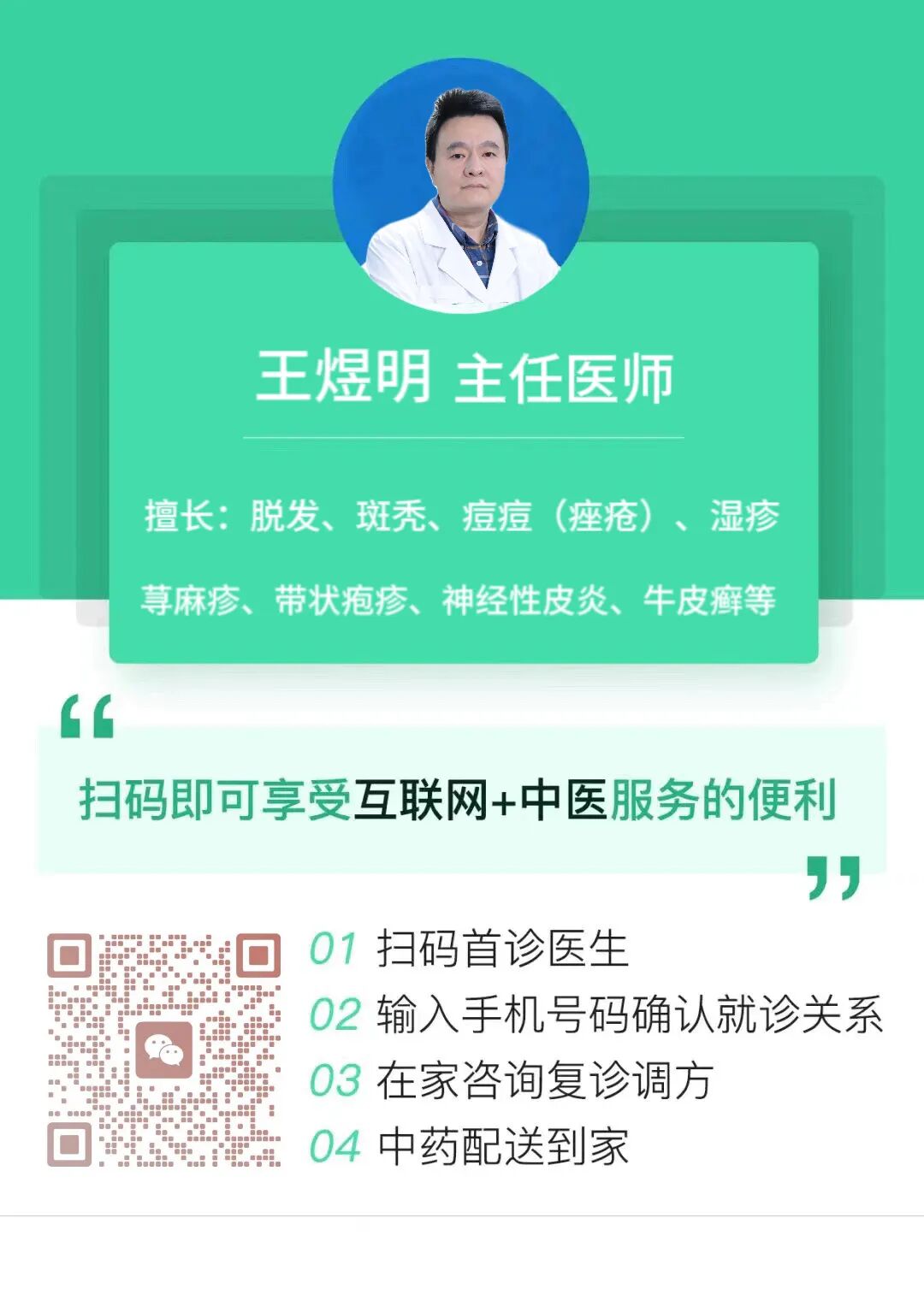王煜明,中国中医科学院广安门医院皮肤科主任医师,中西医结合皮肤病学博士,哈佛医学院(麻省总医院神经科)博士后。从事中西医结合皮肤病专业的临床医疗工作近30余年。如果您有脱发、斑秃、痘痘(痤疮)、荨麻疹、湿疹、带状疱疹、脂溢性皮炎、结节性痒疹、神经性皮炎、牛皮癣、毛囊炎、皮肤瘙痒等问题,可以扫描下方二维码,填写您的问题和症状,帮您辨证调理。